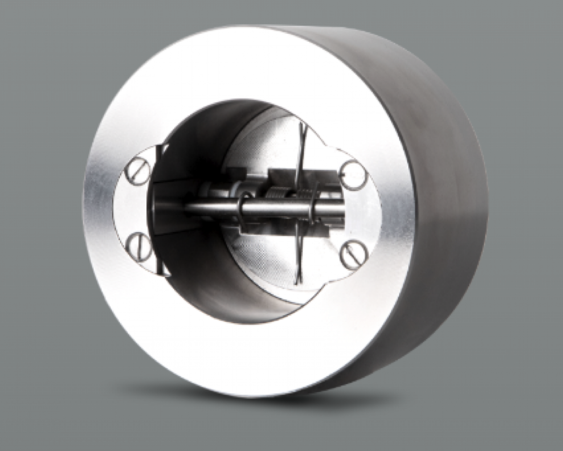 Double plate check valve. Operation is based on fluid pressure: when pressure exceeds a certain threshold, the valve opens, allowing flow. If pressure drops or flow reverses, the valve automatically closes, preventing backflow. Used in high-pressure pipelines. Two types available: Retainer and Retainerless. Self-operating.