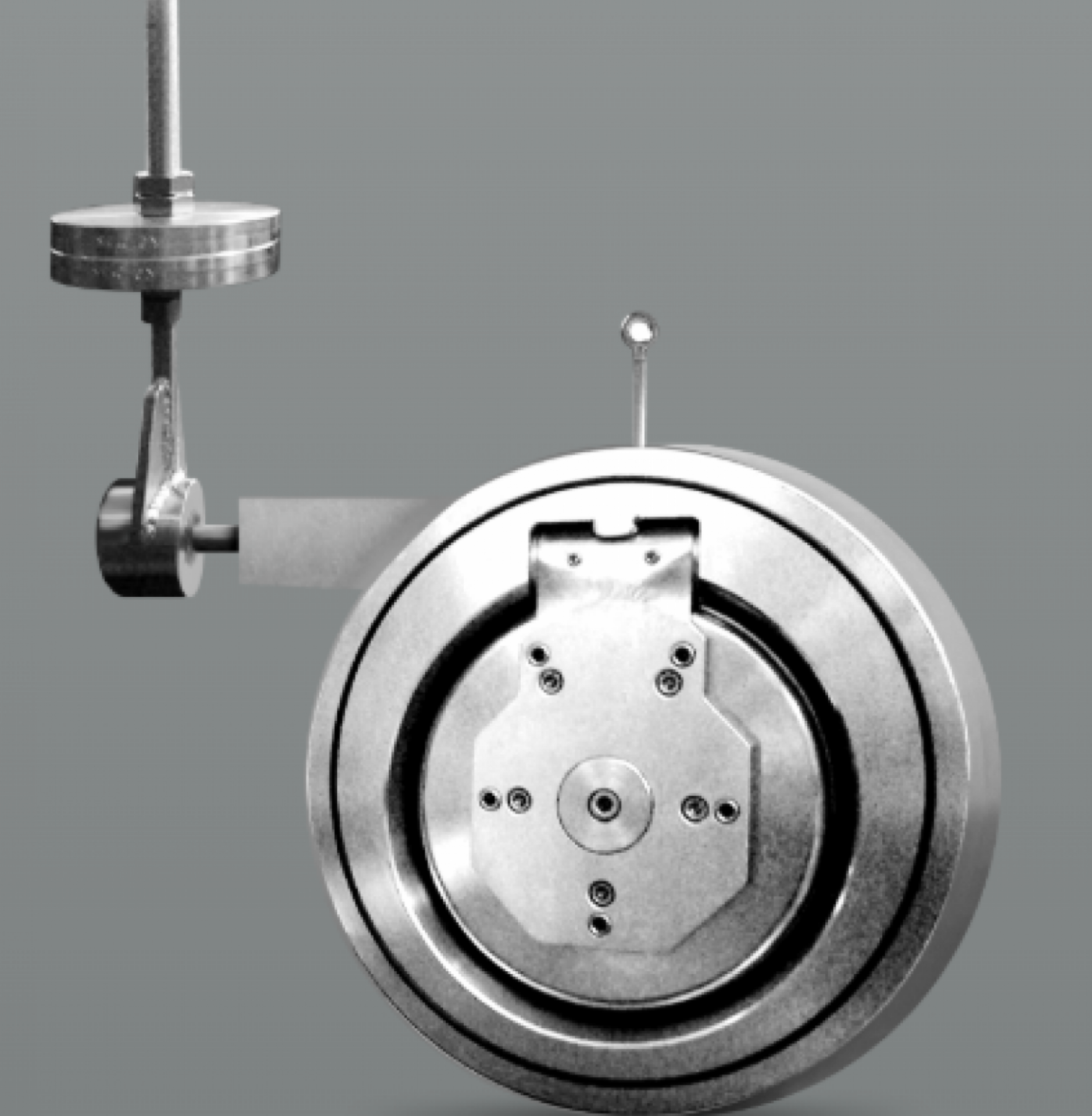 Check valve with counterweight. Operation is based on fluid pressure: when pressure exceeds a certain threshold, the valve opens, allowing flow. If pressure drops or flow reverses, the valve automatically closes, preventing backflow. This type of valve is used for DN sizes above 300. The valve closes smoothly thanks to weights positioned on the side, which apply force to the disc and assist its movement. Self-operating.