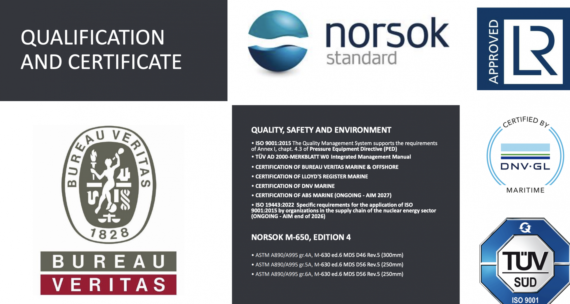 TÜV Italia, LR, DNV e BV sono enti di prova, ispezione e collaudo riconosciute, che offrono una gamma completa di servizi per permettere alle aziende di operare sui mercati nel rispetto di leggi e norme applicabili.